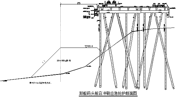 范圍拋填塊石至-22.0m標高。-22.0m平臺頂寬25m,向江側及岸側放坡,坡比1:1。卸船碼頭前沿沖刷應急搶護斷面圖如下: