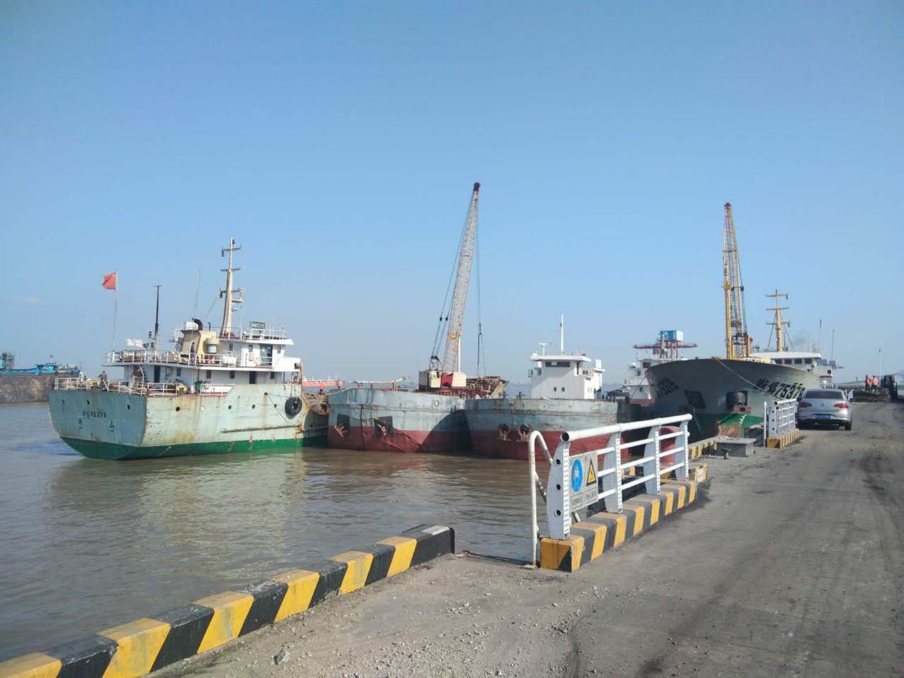 卸船碼頭緊鄰長江主航道,船舶穿梭頻繁,安全隱患大。針對此情況,工程開工前,發(fā)布航行通告,辦理水上水下施工作業(yè)許可證,聽從太倉海事局水上指揮中心指揮,在施工區(qū)域外側設置警戒浮墩;制定船舶航行路線,施工船舶嚴格按照經批準的船舶航行路線航行,加強瞭望;編制應急預案,按規(guī)定開啟船舶警示燈,安排專人值班,瞭望過往船舶,發(fā)現意外情況,按照預案緊急處置。